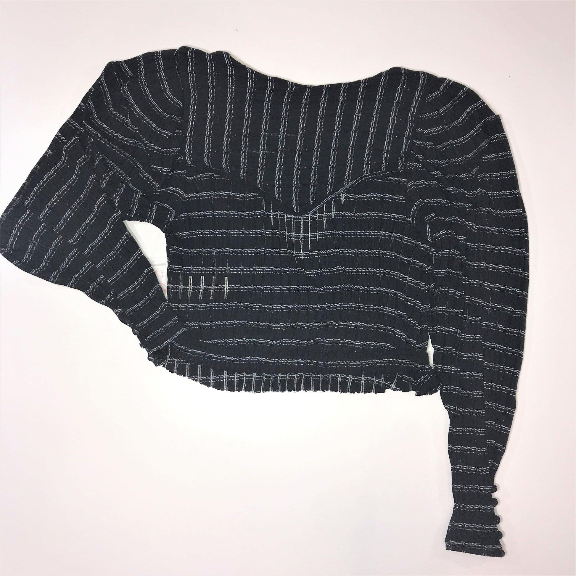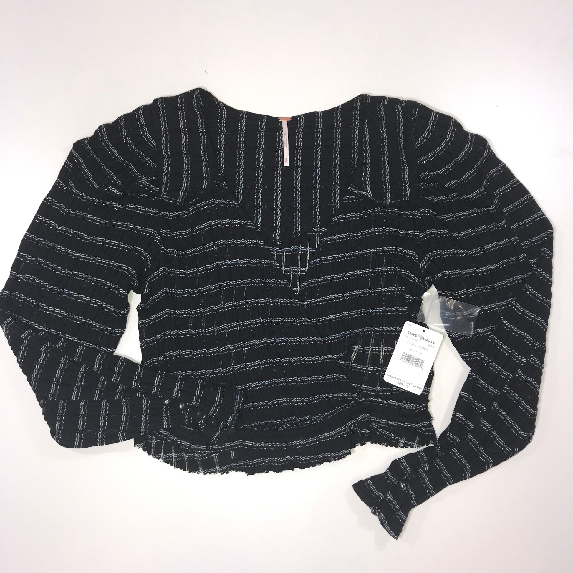The Free People Girlfriend Black Combo Top is a chic and comfortable piece, designed with a relaxed yet stylish silhouette. It features puffed long sleeves that add a touch of drama, paired with a deep V-neckline that offers a flattering and feminine look. The sleeves have an elongated cuff with a button closure, adding a refined detail to the overall design.