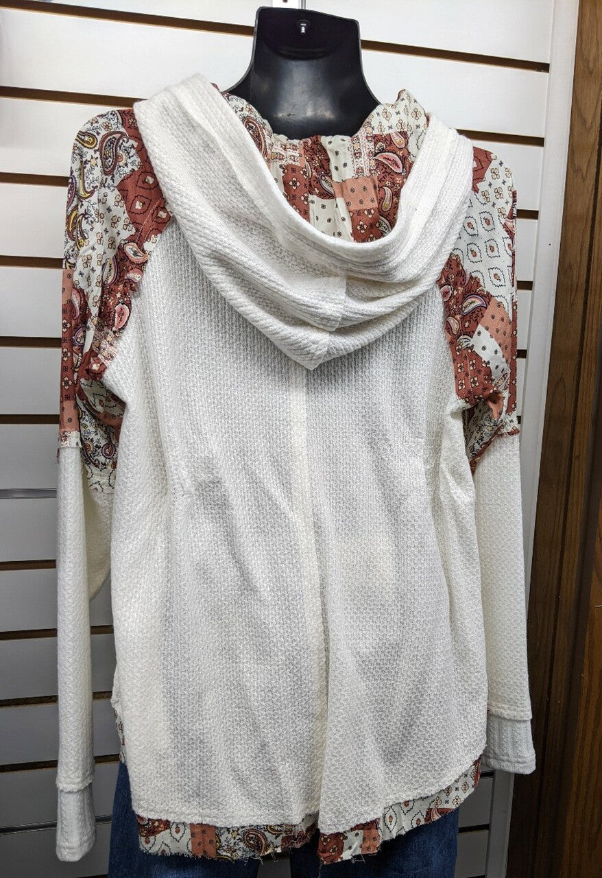 Add a touch of style and comfort to your wardrobe with the Miss Me Women's Patched Knit V-neck Pullover Hoodie. Crafted from cozy waffle knit fabric, this hoodie features a paisley patchwork print contrast that adds a unique and bold flair. The front button closure offers a customizable fit, while the raw bottom hem gives it a laid-back, unfinished look.